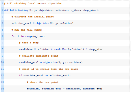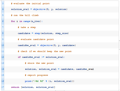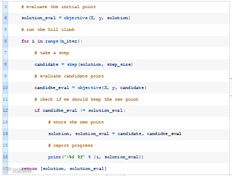 接下来,我们可以定义随机爬山算法(https://machinelearningmastery.com/stochastic-hill-climbing-in-python-from-scratch/)。