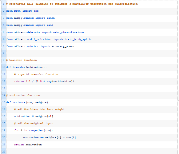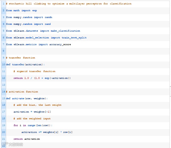 结合这一点,下面列出了应用随机爬山算法优化二分类MLP模型权重的完整示例。