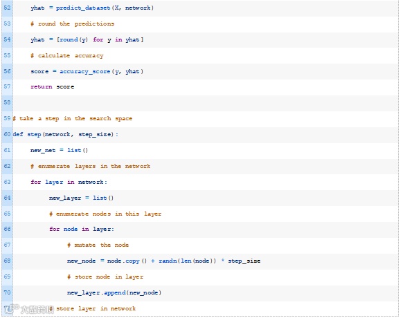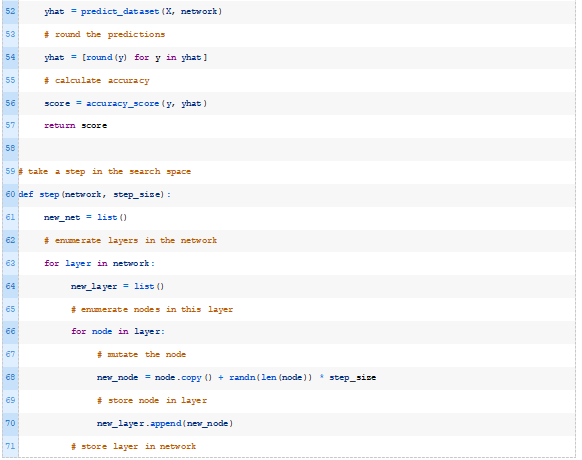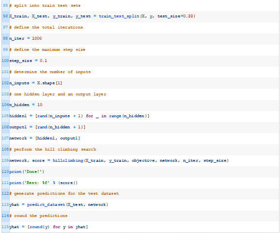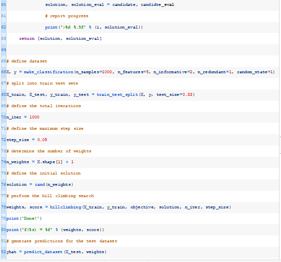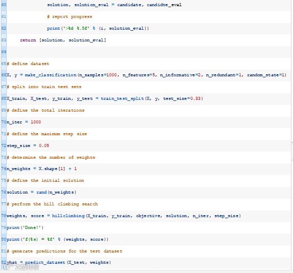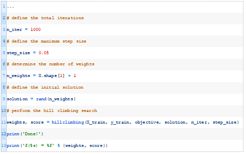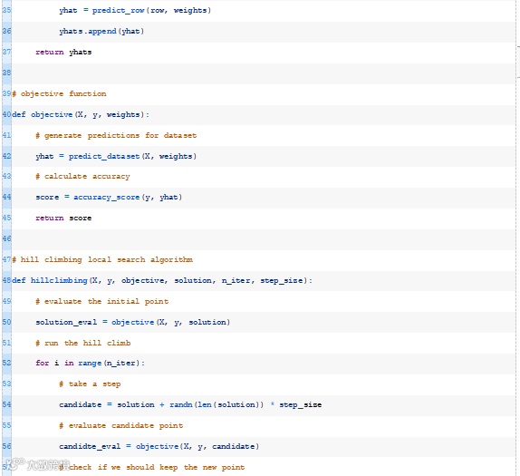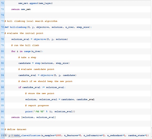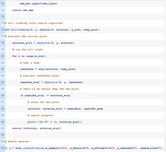 下面的hillclimbing()函数实现了这一点,它将数据集、目标函数、初始解和超参数作为参数,并返回找到的最佳权重集和估计的性能。