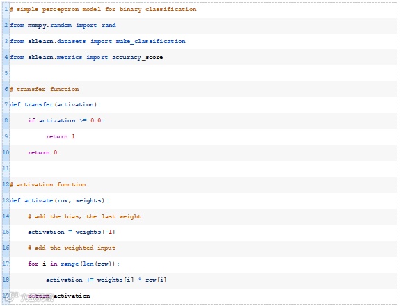 感知器算法(https://machinelearningmastery.com/implement-perceptron-algorithm-scratch-python/)是最简单的人工神经网络。