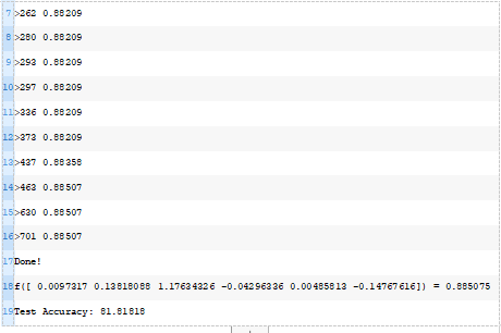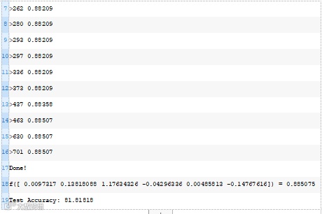在这种情况下,我们可以看到优化算法找到了一组权重,在训练数据集上达到了88.5%的准确率,在测试数据集上达到了81.8%的准确率。