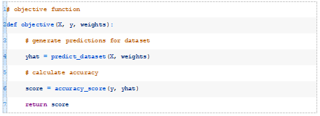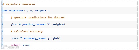 下面的objective()函数通过给定数据集和一组权重来实现这一点,并返回模型的精度。