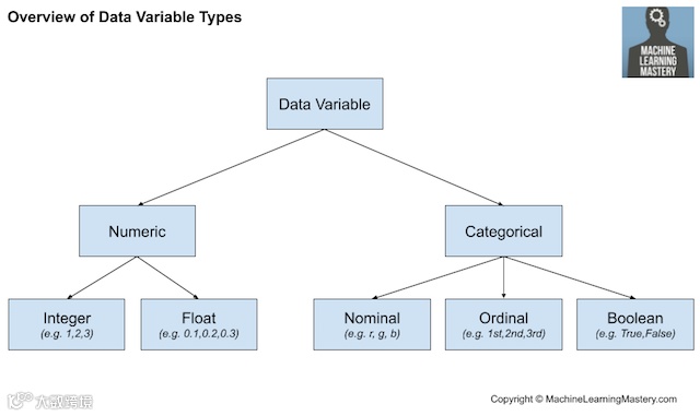 回想一下,数据可能是下面几种类型中的一种,比如数值型(numeric)或分类型(categorical),每种类型都有子类型,比如整数型(integer)和实数型(real-valued)属于数值型(numeric)数据,名义型(nominal)、序数型(ordinal)和布尔型(boolean)属于分类型(categorical)数据。