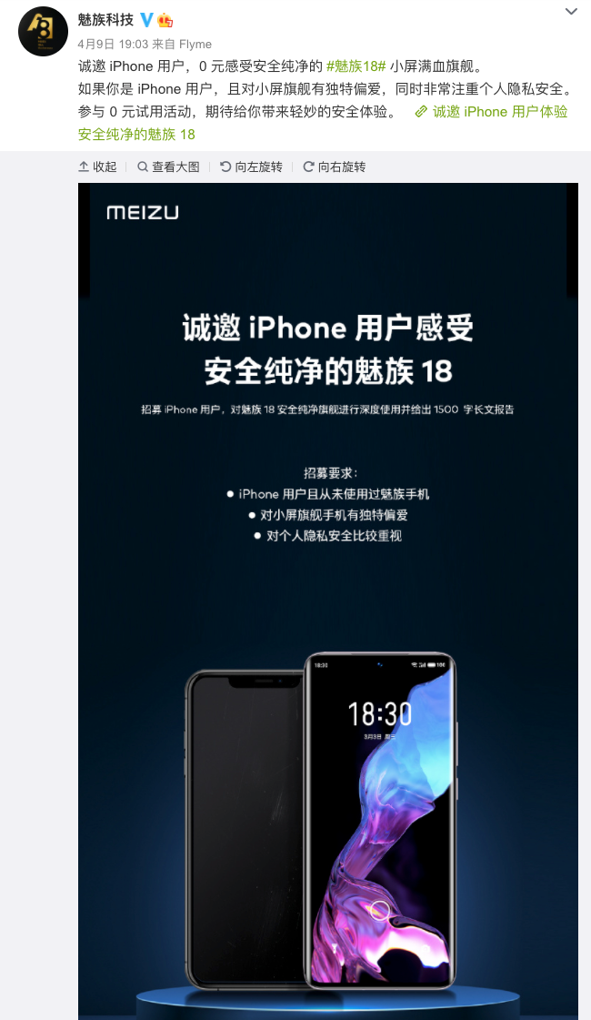 魅族官方发起了一个0元试用魅族18的招募活动,面向从而使用过魅族手机的iPhone用户,且希望其对小屏旗舰手机独特偏爱、对个人隐私安全比较重视,申请成功后获取资格的用户即可收到魅族官方寄去的魅族18,最终需提交一份1500字长文体验报告。为了吸引iPhone用户也算是蛮用下心的吧。
