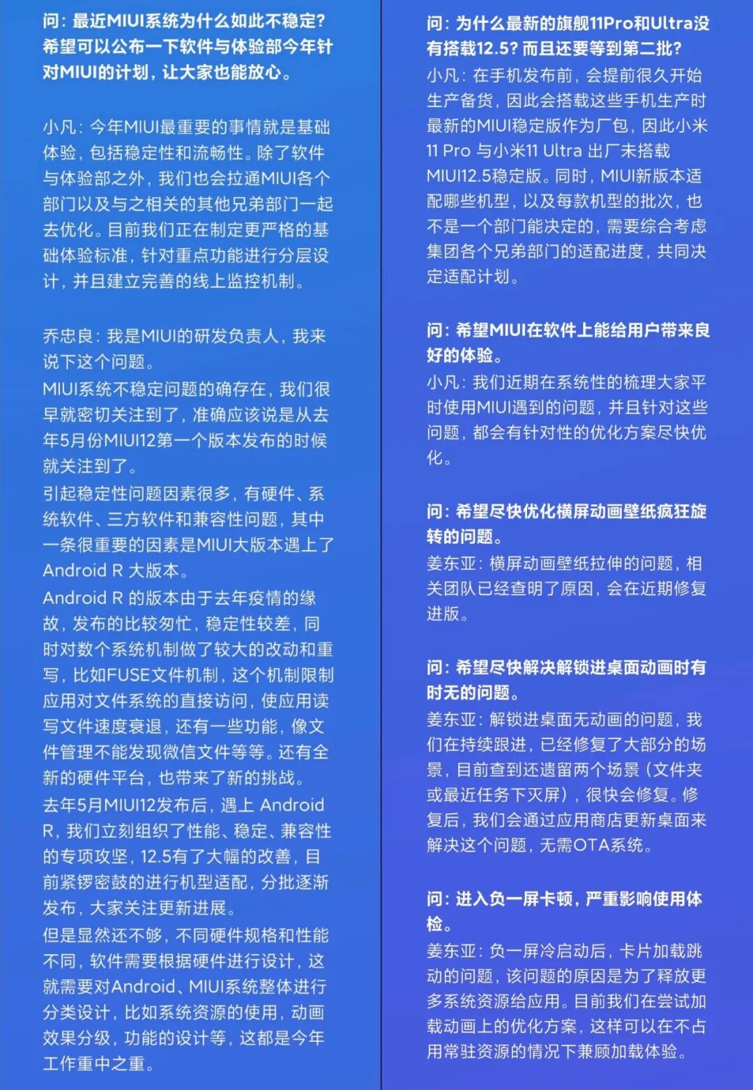 首先针对MIUI基础体验不稳定的反馈,相关负责人表示很早之前就关注到了,其中重要一条因素是MIUI大版本遇上了Android R大版本。像小米11 Pro和小米11 Ultra出厂没能预装MIUI 12.5且在第二批适配名单内,原因是因为小米11Pro/Ultra很早前就开始生产备货,以生产时最新的MIUI稳定版作为出厂包。