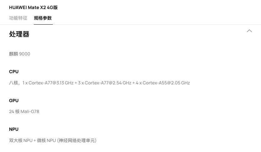 如上图所见,华为Mate X2折叠屏4G版上架华为官网,同样是麒麟9000处理器 但少了5G支持,价格暂未公布。
