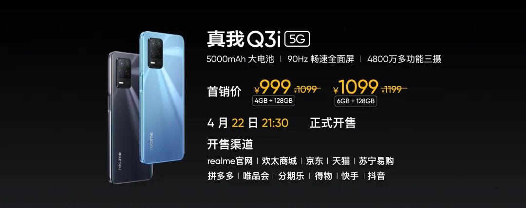 realme真我Q3i售价及开售时间:4+128GB售价1099元(首销999元),6+128GB售价1199元(首销1099元),今晚21:30直接开售。