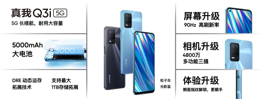 realme真我Q3i主要参数:6.5英寸2400*1080分辨率的左上角单挖孔LCD屏,90Hz高刷,侧面指纹,机身三围162.5*74.8*厚8.5mm,重185g,粒子灰/光影蓝2个配色,前置8MP,后置三摄48MP+2MP+2MP。