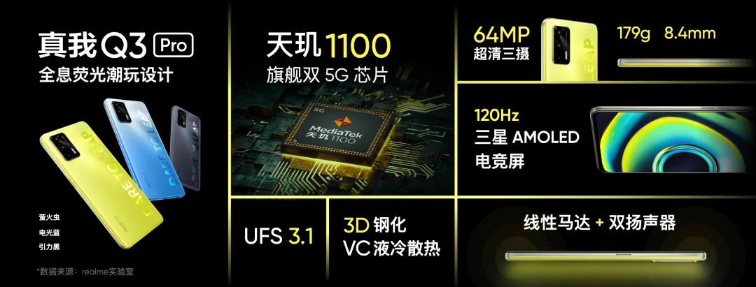 realme真我Q3 Pro:6.43英寸2400*1080分辨率的左上角单挖孔三星AMOLED屏,120Hz高刷+360Hz触控采样率,屏下指纹,机身三围158.5*73.3*厚8.4mm,重179g,萤火虫/电光蓝/引力黑3个配色, 前置16MP,后置三摄64MP+8MP超广角+2MP。