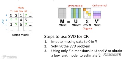 适用于推荐系统的矩阵分解的主要方法有两种:奇异值分解(Singular Value Decomposition)和梯度下降(Gradient Descent)。