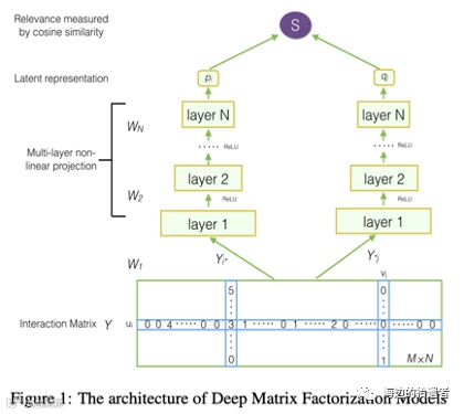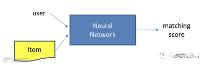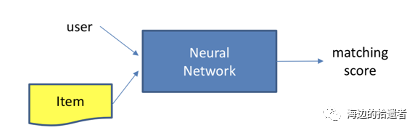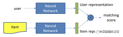 用户和物品分别通过神经网络生成各自的Embedding向量,即表示向量。将其作为中间产物,然后再通过内积等交互函数得到匹配分数,进行排序推荐。