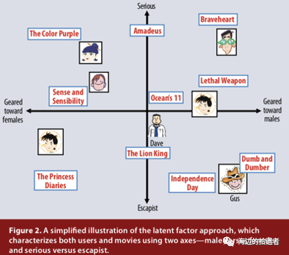 矩阵分解引入了一个隐向量(latent vector)的概念,通过从物品评分模式中推断出的隐向量来表征物品和用户。隐向量,类似于NLP中的Word2vec技术,也就是后来深度学习中的Embedding向量。隐向量的不同的因子可能表示不同的具体含义,对于电影来说,发现的因素可能会衡量明显的维度,例如喜剧与戏剧,动作量或对儿童的定向;不太明确的尺寸,例如角色发展的深度或古怪程度;亦或者是完全无法解释的尺寸。对于用户来说,每个因素都会衡量用户对在相应电影的喜欢程度。