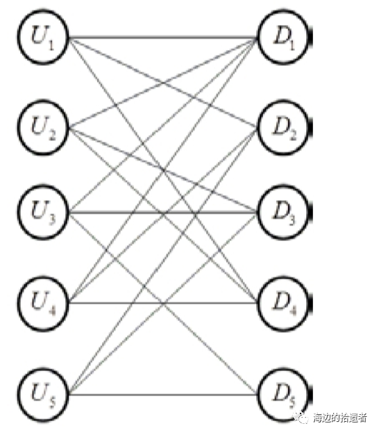 在推荐系统中,其最终的目的是为用户Ui 推荐相关的商品,此时,对于用户Ui ,需要计算商品列表{D1 ,D2 ,...,D5 }中的商品对其重要性程度,并根据重要性程度生成最终的推荐列表。PageRank算法是用于处理图上的重要性排名的算法。