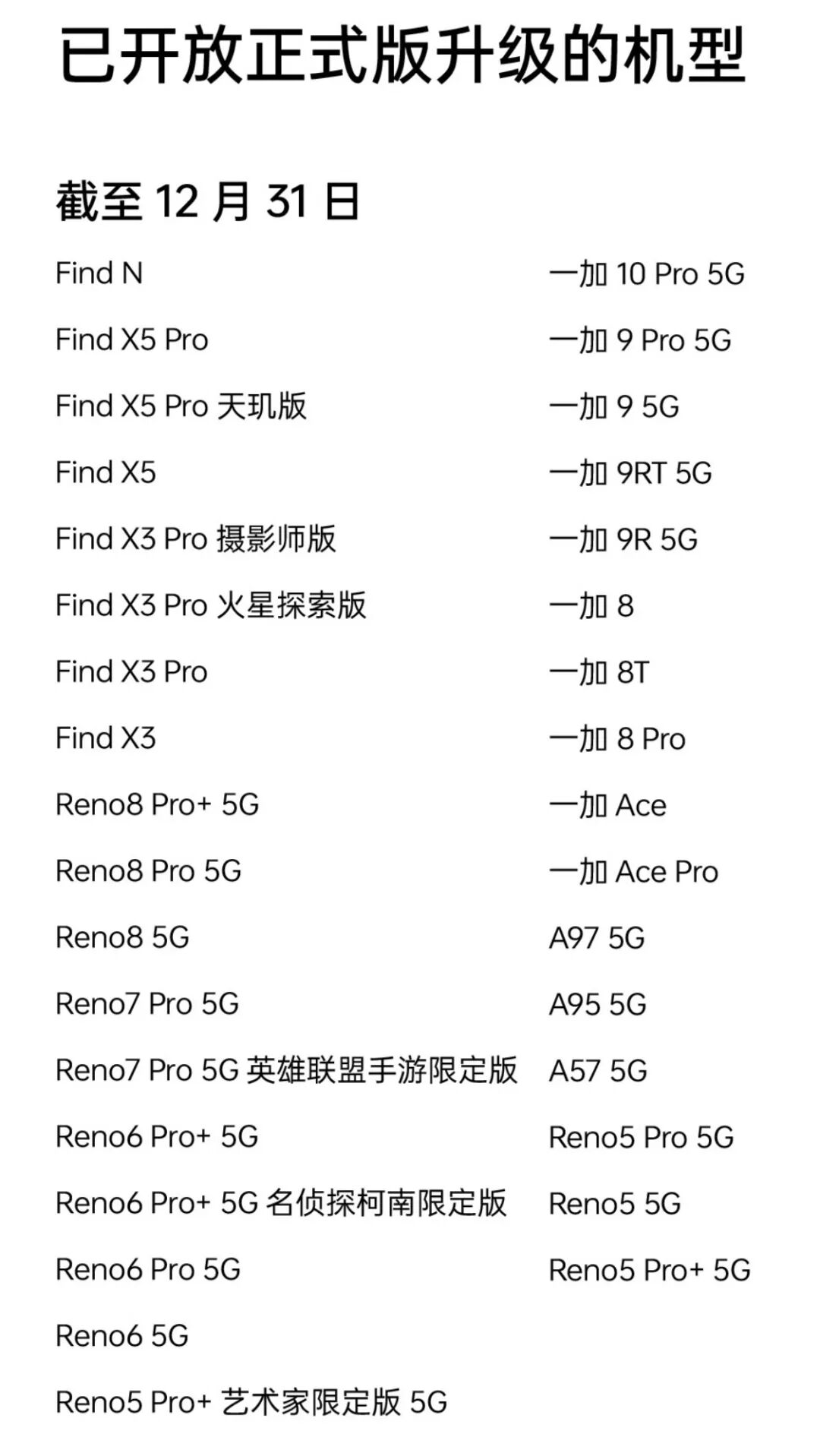 已开放ColorOS 13正式版升级的机型名单可以看上图。