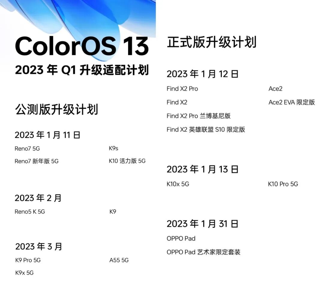 1月份计划适配ColorOS 13正式版的机型有:OPPO Find X2/英雄联盟S10限定版、Find X2 Pro/兰博基尼版、Ace2/EVA限定版;OPPO K10x、K10 Pro;OPPO Pad/艺术家限定套装。公测版则有Reno7、K10活力版、K9等机型。