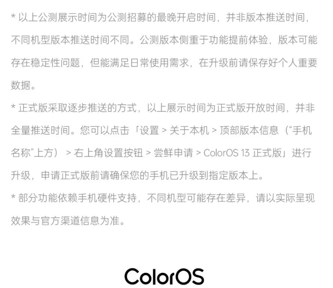 如果在官方公布的时间没有收到推送,可以在设置-关于本机-顶部版本信息-右上角设置按钮-尝鲜申请-ColorOS 13正式版 进行升级。问问大家,现在用的系统版本都是正式版吗?