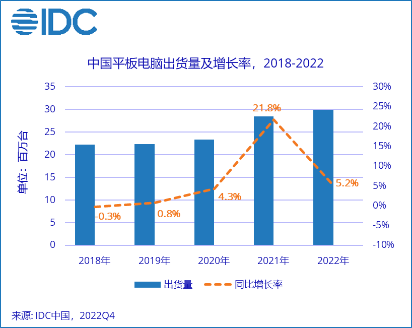 报告显示,2022年第四季度(10-12月),中国平板电脑市场出货量约866万台,同比增长约16.7%,其中消费市场同比增长25.8%,商用市场同比下降40.3%。2022年全年中国平板市场出货量同比去年增长5.2%,自2019年以来连续四年实现增长。