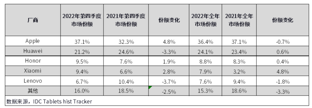 具体2022Q4和2022全年中国平板电脑市场份额排名见上图,2022全年数据来说 市占率排名前五的厂商依次是:①苹果36.4% ②华为24.1% ③荣耀8.8% ④小米7.9% ⑤联想7.6%(其他家品牌合计15.3%),对比2021年数据 可以看到小米从Others晋升到了前五 位列第四,米板用户还是挺多的。