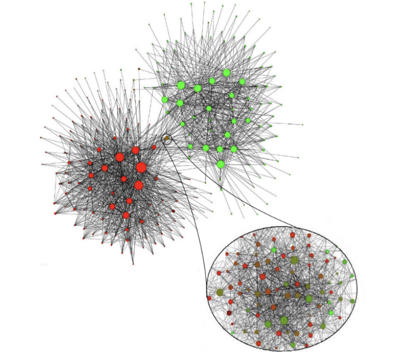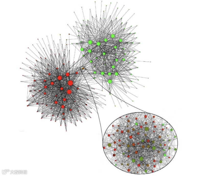 比利时移动网络中的语言社区(红色=法语,绿色=荷兰语)。图片来自Blondel,Vincent D.等人。“大型网络中社区的快速发展。”统计力学杂志:理论与实验2008.10(2008):P10008