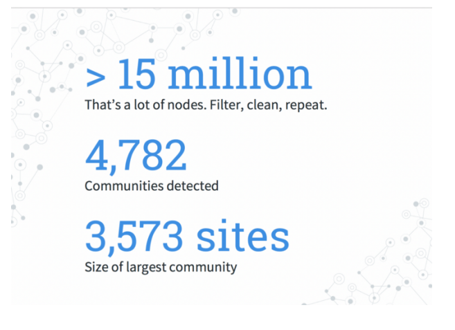我最初在原始数据中拥有超过1500万个网站。有很多节点,其中许多包含冗余信息。我描述的数据清洗过程将图压缩成更少,更有意义的边。