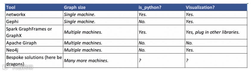 对于适合在一台计算机上计算的数据,networkx(https://networkx.github.io/) Python软件包是探索图的理想选择,它实现了最常见的算法(包括标签传播,PageRank,最大集团检测等),简单的可视化也是可能的。