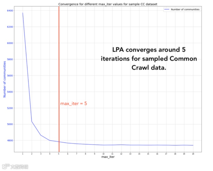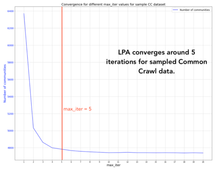 在我的数据集中,LPA确实收敛了约5次迭代。可以看到社区数量趋于稳定,大约为4,700。Raghavan和她的同事们也通过其带有标签的图表显示了此属性。