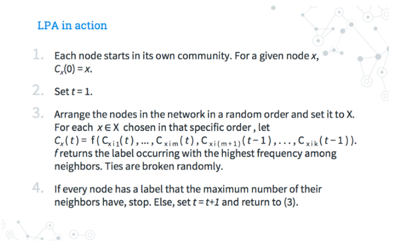 尽管有许多社区检测技术,但本文仅关注一种:标签传播。有关其他方法的概述,我推荐Santo Fortunato的“图形中的社区检测”(https://arxiv.org/pdf/0906.0612.pdf)。