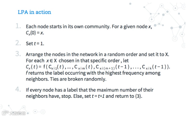 参数调整非常简单。LPA使用max_iterations参数运行,并且使用默认值5就可以获得良好的结果。Raghavan和她的合作者针对几个标记的网络测试了LPA。他们发现至少有95%的节点在5次迭代中被正确分类。