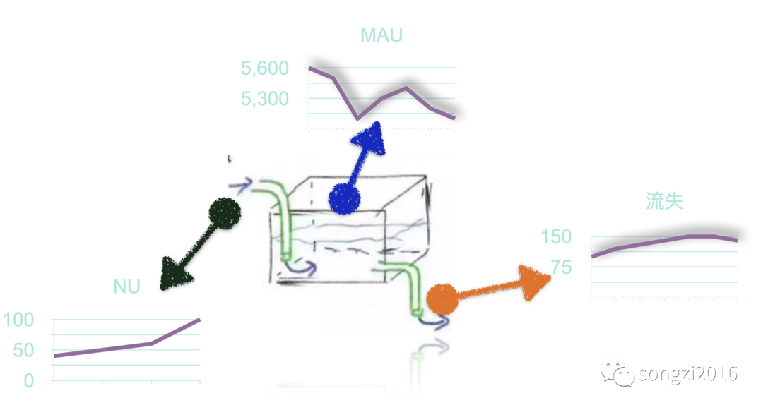 做流量通常都会看到这样一个图,每日的 DAU 、每月的 MAU 相当于一个大水池子,新用户相当于入水口,流失相当于出水口。如果想不断增加水池水量,办法只有增加入水口水量或减少出水口的量,这样才能让水池的水逐渐的增加。