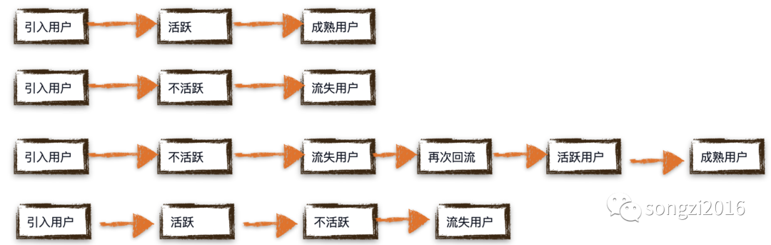 从用户的引入到最后的离开,用户在产品中经历过的几个不同路径经模拟有,下面大概四种类型路径:
