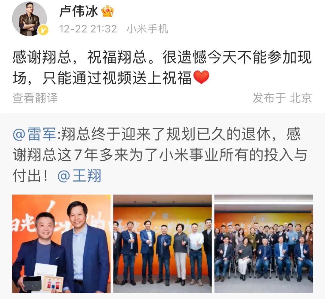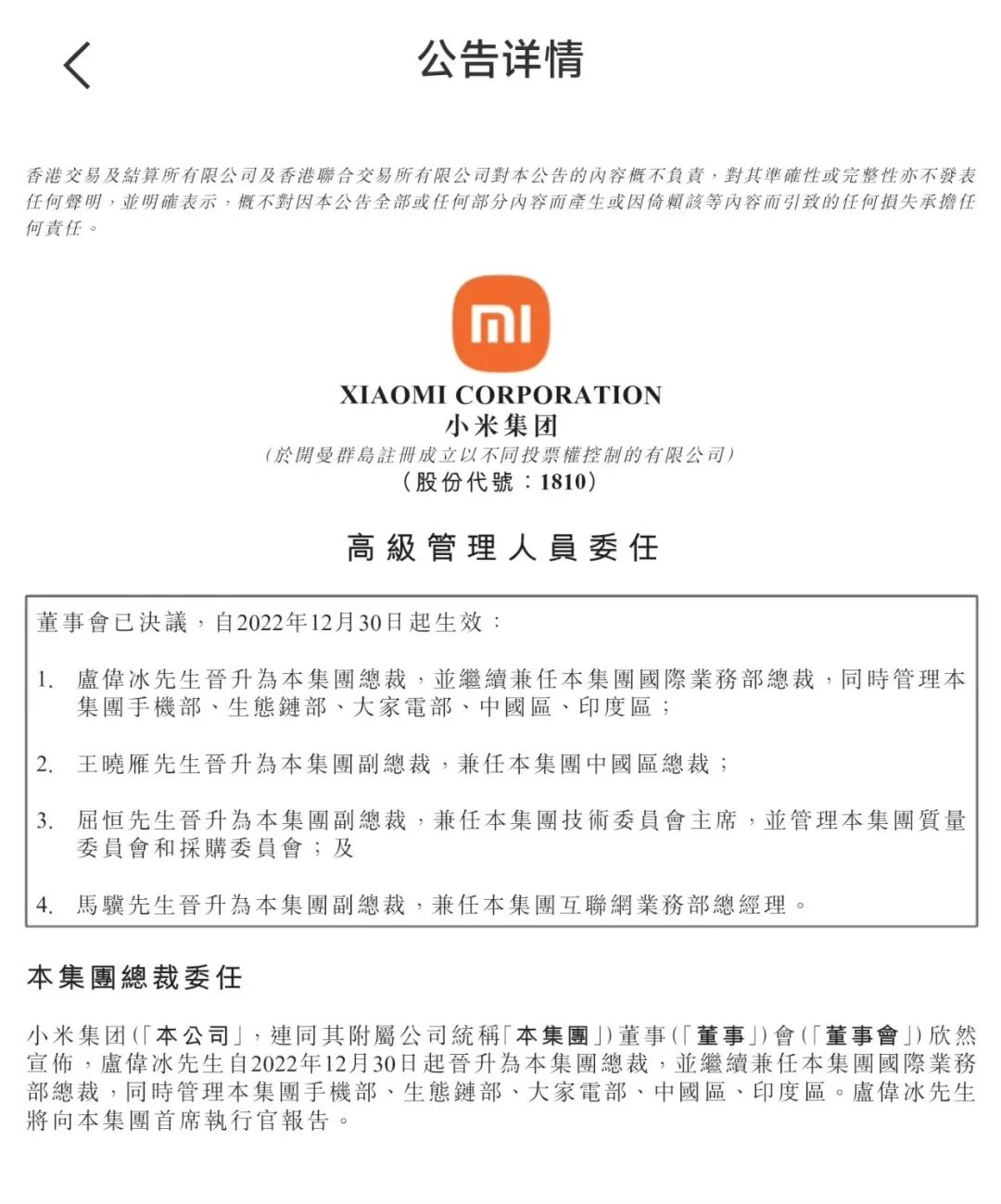 12月22日,小米雷军发布全员内部信,宣布小米集团总裁王翔将于月底退休,作为高级顾问继续为公司服务,小米集团总裁一职将由卢伟冰接任。今天小米集团在港交所公告正式宣布了相关人事调整。