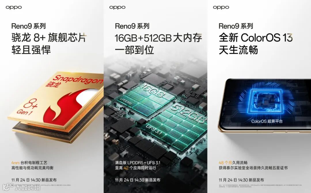 据预热海报显示,OPPO Reno9系列预装全新ColorOS 13,最高提供16+512GB版本,满血版LPDDR5+UFS 3.1,官方称最高能42个应用同时运行,Reno9 Pro+搭载骁龙8+处理器。