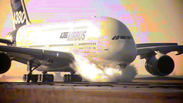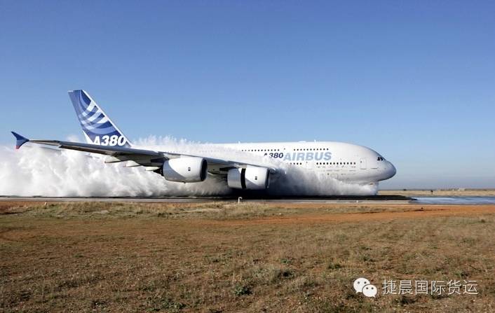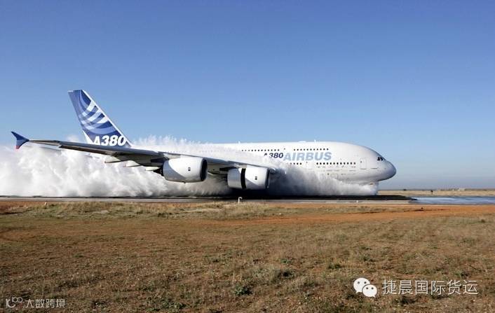 上图为A380进行测水试验时的视频片段,巨大的机身冲过被水填满的跑道,激起巨大的水花。