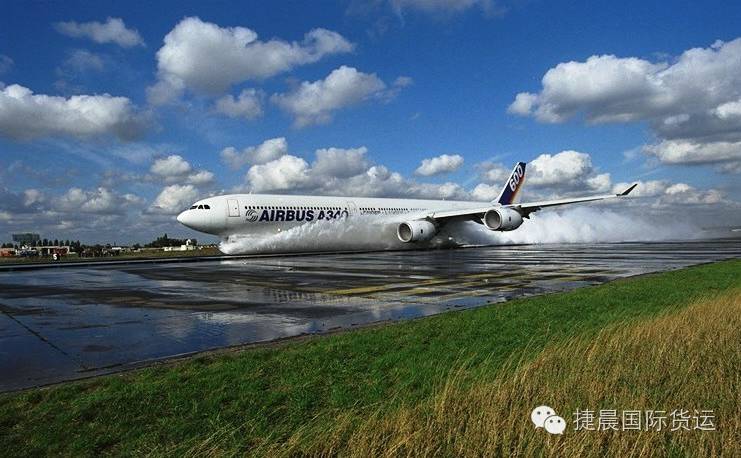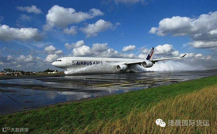 在进行试验时飞机会以不同的速率通过试验场地,来进行验证。图为A340客机在进行测水试验。