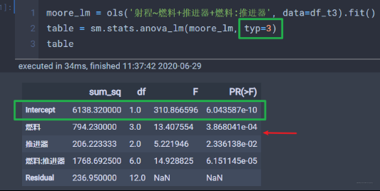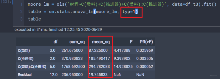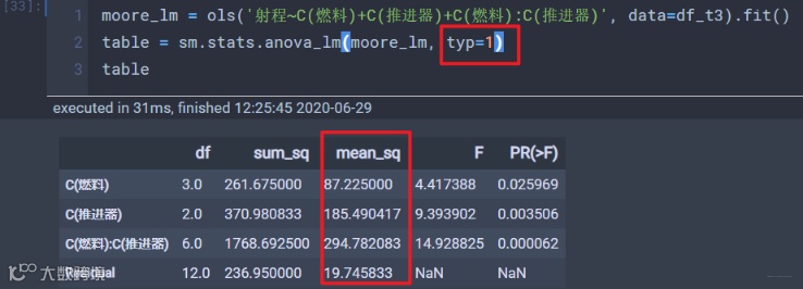 moore_lm = ols('射程~燃料+推进器+燃料:推进器', data=df_t3).fit()table = sm.stats.anova_lm(moore_lm, typ=1)table