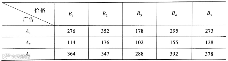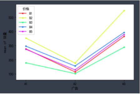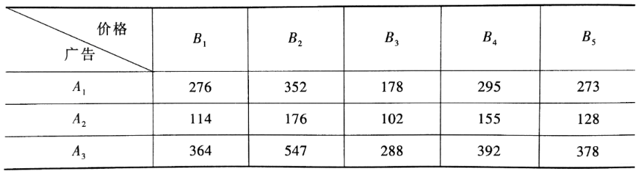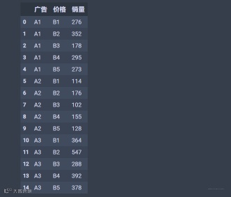 dic_t2=[{'广告':'A1','价格':'B1','销量':276},{'广告':'A1','价格':'B2','销量':352},{'广告':'A1','价格':'B3','销量':178},{'广告':'A1','价格':'B4','销量':295},{'广告':'A1','价格':'B5','销量':273},{'广告':'A2','价格':'B1','销量':114},{'广告':'A2','价格':'B2','销量':176},{'广告':'A2','价格':'B3','销量':102},{'广告':'A2','价格':'B4','销量':155},{'广告':'A2','价格':'B5','销量':128},{'广告':'A3','价格':'B1','销量':364},{'广告':'A3','价格':'B2','销量':547},{'广告':'A3','价格':'B3','销量':288},{'广告':'A3','价格':'B4','销量':392},{'广告':'A3','价格':'B5','销量':378}]df_t2=pd.DataFrame(dic_t2,columns=['广告','价格','销量'])df_t2