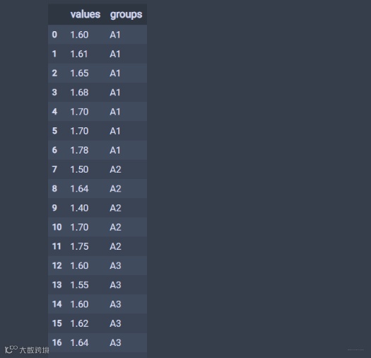 values = A1.copy()groups = []for i in range(1, len(data)):values.extend(data[i])for i, j in zip(range(4), data):groups.extend(np.repeat('A'+str(i+1), len(j)).tolist())df = pd.DataFrame({'values': values, 'groups': groups})df