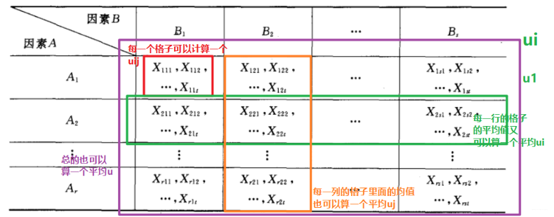 与单因素的情况类似, 我们依然是采用平方和分解的方式进行验证。首先我们得先计算四个平均值: