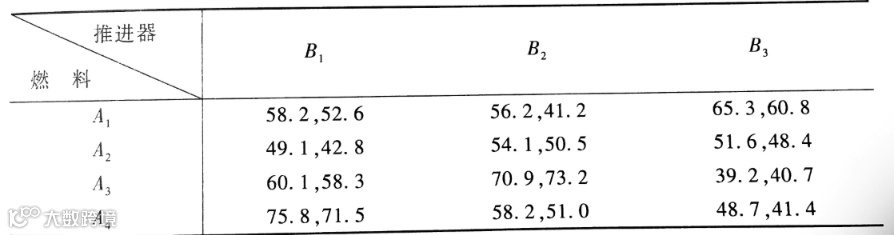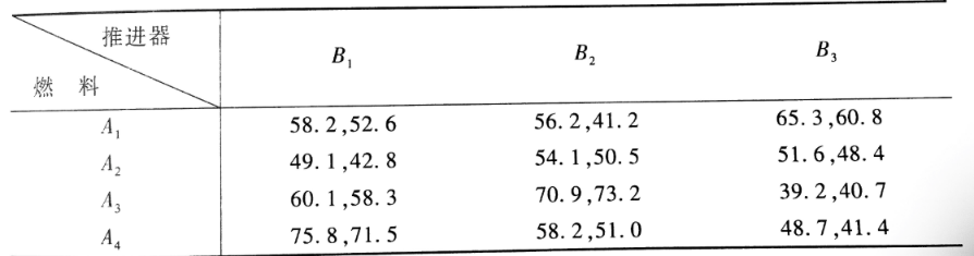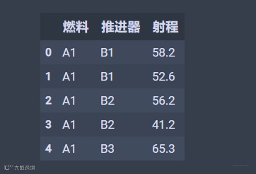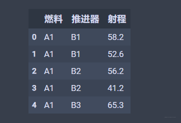 dic_t3=[{'燃料':'A1','推进器':'B1','射程':58.2},{'燃料':'A1','推进器':'B1','射程':52.6},{'燃料':'A1','推进器':'B2','射程':56.2},{'燃料':'A1','推进器':'B2','射程':41.2},{'燃料':'A1','推进器':'B3','射程':65.3},{'燃料':'A1','推进器':'B3','射程':60.8},{'燃料':'A2','推进器':'B1','射程':49.1},{'燃料':'A2','推进器':'B1','射程':42.8},{'燃料':'A2','推进器':'B2','射程':54.1},{'燃料':'A2','推进器':'B2','射程':50.5},{'燃料':'A2','推进器':'B3','射程':51.6},{'燃料':'A2','推进器':'B3','射程':48.4},{'燃料':'A3','推进器':'B1','射程':60.1},{'燃料':'A3','推进器':'B1','射程':58.3},{'燃料':'A3','推进器':'B2','射程':70.9},{'燃料':'A3','推进器':'B2','射程':73.2},{'燃料':'A3','推进器':'B3','射程':39.2},{'燃料':'A3','推进器':'B3','射程':40.7},{'燃料':'A4','推进器':'B1','射程':75.8},{'燃料':'A4','推进器':'B1','射程':71.5},{'燃料':'A4','推进器':'B2','射程':58.2},{'燃料':'A4','推进器':'B2','射程':51.0},{'燃料':'A4','推进器':'B3','射程':48.7},{'燃料':'A4','推进器':'B3','射程':41.4},]df_t3=pd.DataFrame(dic_t3,columns=['燃料','推进器','射程'])df_t3.head()