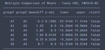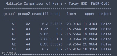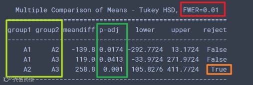 这个可以得到的结论是在显著水平0.01的时候, A2和A3的p值小于0.01, reject=True, 即认为A2和A3有显著性差异。
