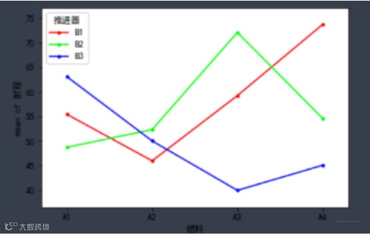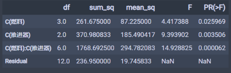 '射程~C(燃料)+C(推进器)+C(燃料):C(推进器)' :相当于射程是y(指标), 燃料和推进器是x(影响因素), 三项加和的前两项表示两个主效应, 第三项表示考虑两者的交互效应, 不加C也可。