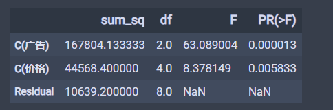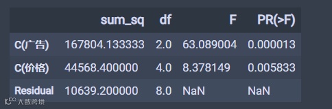 # 方差分析price_lm = ols('销量~C(广告)+C(价格)', data=df_t2).fit()table = sm.stats.anova_lm(price_lm, typ=2)table