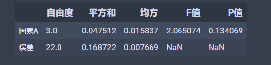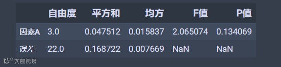anova_res = anova_lm(ols('values~C(groups)', df).fit())anova_res.columns = ['自由度', '平方和', '均方', 'F值', 'P值']anova_res.index = ['因素A', '误差']anova_res # 这种情况下看p值 >0.05 所以接受H0