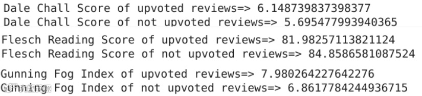 recommend_percentage=pd.DataFrame(((df.groupby('name')['reviews.doRecommend'].sum()*100)/df.groupby('name')['reviews.doRecommend'].count()).sort_values(ascending=True))import textstatdf['dale_chall_score']=df['reviews.text'].apply(lambda x: textstat.dale_chall_readability_score(x))df['flesh_reading_ease']=df['reviews.text'].apply(lambda x: textstat.flesch_reading_ease(x))df['gunning_fog']=df['reviews.text'].apply(lambda x: textstat.gunning_fog(x))print('Dale Chall Score of upvoted reviews=>',df[df['reviews.numHelpful']>1]['dale_chall_score'].mean())print('Dale Chall Score of not upvoted reviews=>',df[df['reviews.numHelpful']<=1]['dale_chall_score'].mean())print('Flesch Reading Score of upvoted reviews=>',df[df['reviews.numHelpful']>1]['flesh_reading_ease'].mean())print('Flesch Reading Score of not upvoted reviews=>',df[df['reviews.numHelpful']<=1]['flesh_reading_ease'].mean())print('Gunning Fog Index of upvoted reviews=>',df[df['reviews.numHelpful']>1]['gunning_fog'].mean())print('Gunning Fog Index of not upvoted reviews=>',df[df['reviews.numHelpful']<=1]['gunning_fog'].mean())