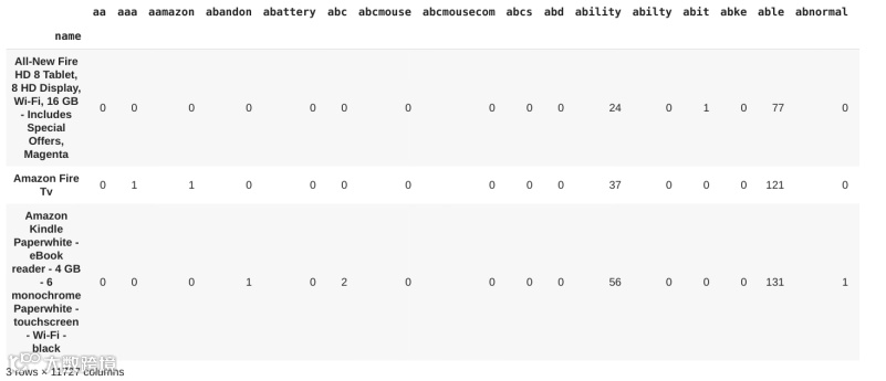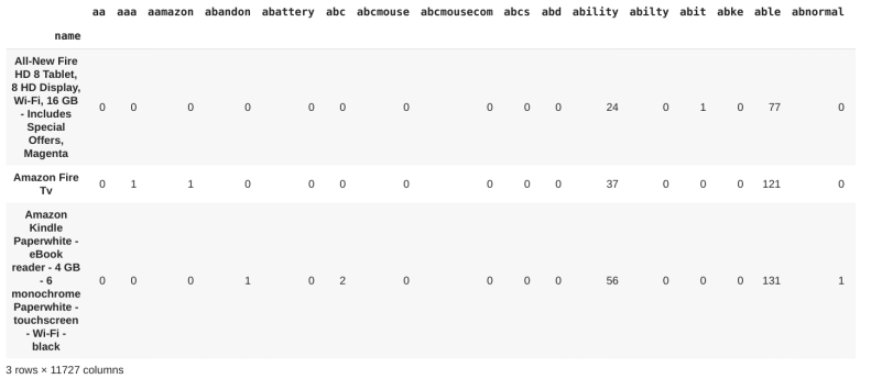 # Creating Document Term Matrixfrom sklearn.feature_extraction.textimport CountVectorizer cv=CountVectorizer(analyzer='word')data=cv.fit_transform(df_grouped['lemmatized'])df_dtm = pd.DataFrame(data.toarray(), columns=cv.get_feature_names())df_dtm.index=df_grouped.indexdf_dtm.head(3)
