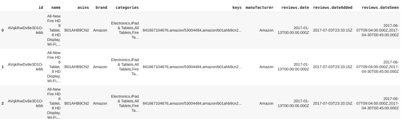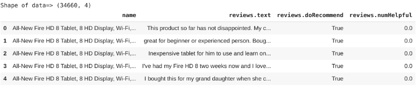 df=df[['name','reviews.text','reviews.doRecommend','reviews.numHelpful']]print("Shape of data=>",df.shape)df.head(5)