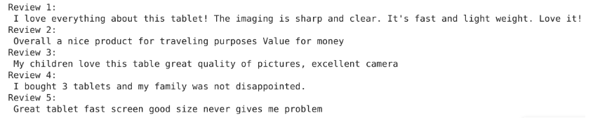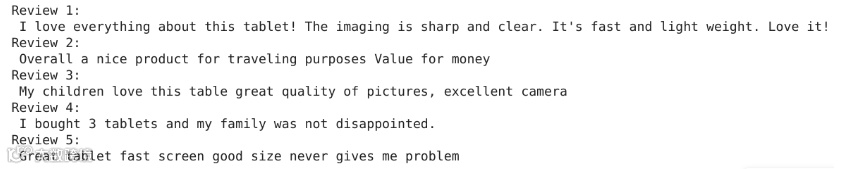 for index,text in enumerate(df['reviews.text'][35:40]):print('Review %d:\n'%(index+1),text)