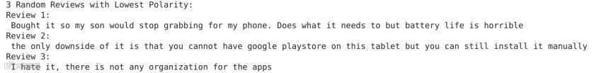 print("3 Random Reviews with Lowest Polarity:")for index,review in enumerate(df.iloc[df['polarity'].sort_values(ascending=True)[:3].index]['reviews.text']):print('Review {}:\n'.format(index+1),review)