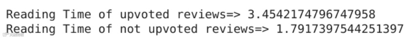 df['reading_time']=df['reviews.text'].apply(lambda x: textstat.reading_time(x))print('Reading Time of upvoted reviews=>',df[df['reviews.numHelpful']>1]['reading_time'].mean())print('Reading Time of not upvoted reviews=>',df[df['reviews.numHelpful']<=1]['reading_time'].mean())