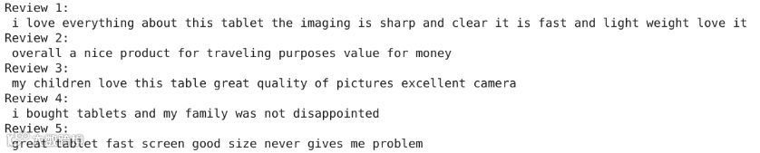 for index,text in enumerate(df['cleaned'][35:40]):print('Review %d:\n'%(index+1),text)